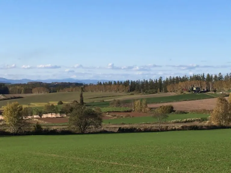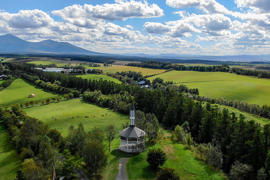 美瑛のパノラマロード沿いに位置する、十勝岳連峰の雄大な山並みと波状丘陵を一望できる展望公園。美瑛を象徴する丘陵地帯にあるこの公園は、大雪山国立公園・十勝岳連峰のダイナミックな稜線を背景に、パノラマロードの全景を見渡せる絶好のポイント。。南西に目を向ければ、赤い三角屋根の塔が目印の美馬牛小学校が緑の丘に映え、絵画のような景色が広がります。大型バスが立ち寄ることがほとんどない穴場です。
